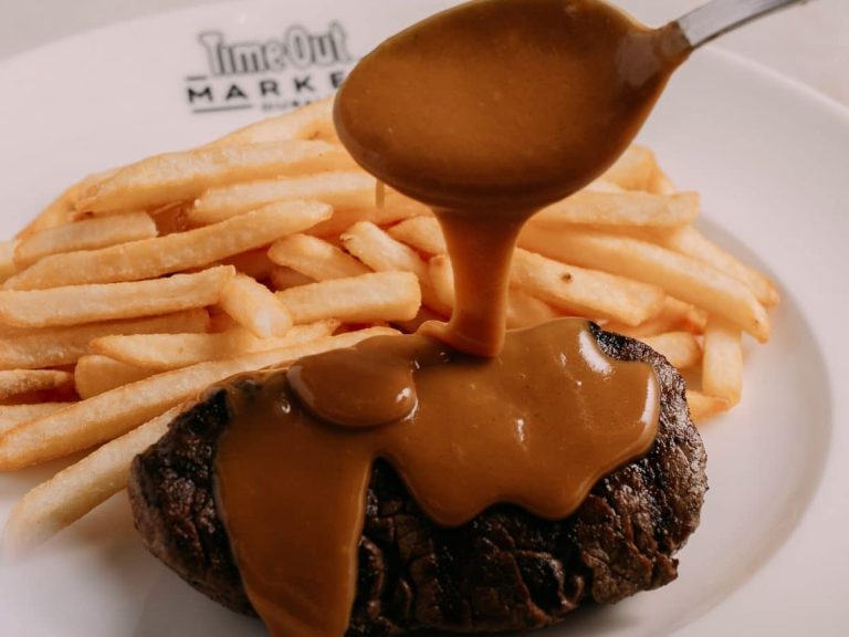 The menu at Time Out Market is a focused selection of French brasserie classics. Steak frites is the centrepiece, served with crispy fries. Escargots come in garlic and parsley butter, and a chicken and wild mushroom vol-au-vent rounds out the savoury options. The Market also carries an exclusive dish: fish frites made with a fresh catch from the Arabian Sea. Pain perdu is available for those who want to finish on something sweet.