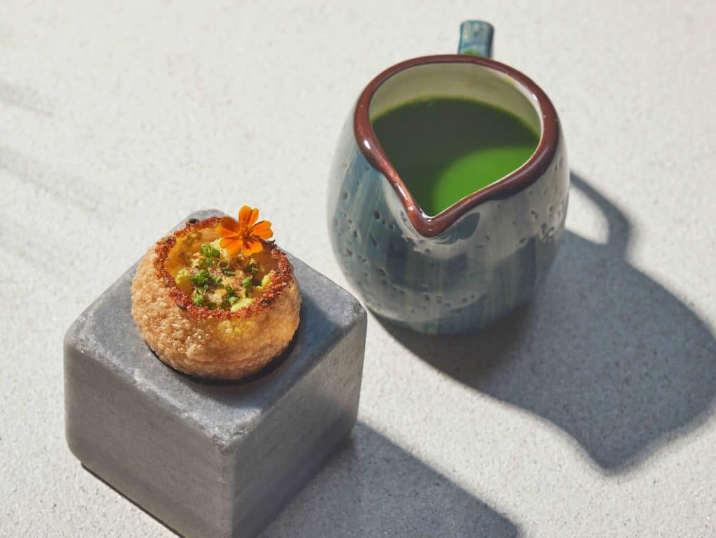 The menu is priced at Dhs225 and takes its inspiration from Kelvin’s travels and personal history. It opens with lobster pani puri, a reworked version of one of the restaurant’s established starters, followed by watermelon with dry-aged sea bream and wasabi-infused olive oil, a dish that came out of a creative collaboration in Amman.