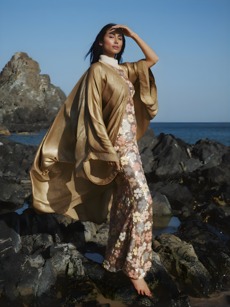 Layering is a consistent feature across the drop. The lineup includes feather-trimmed and metallic abayas, sheer organza toppers and fluid overlays. Pieces such as She – No Additions, She – Nothing Extra and She – Nearly Invisible add further styling options. The full collection also covers a wider range of dresses and statement layers across different colours and fabrics.